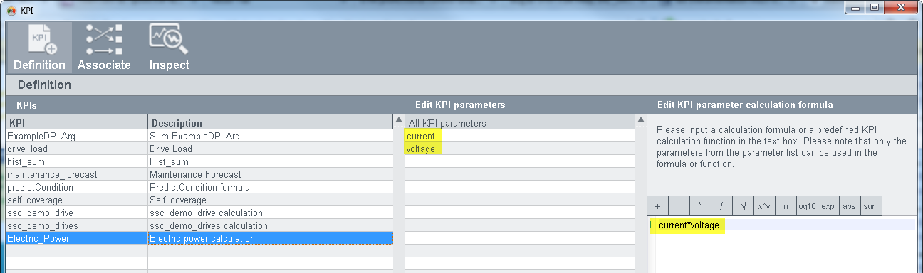 - Enter the calculation formula "current* voltage" into the text area "Edit KPI parameter calculation formula" (see