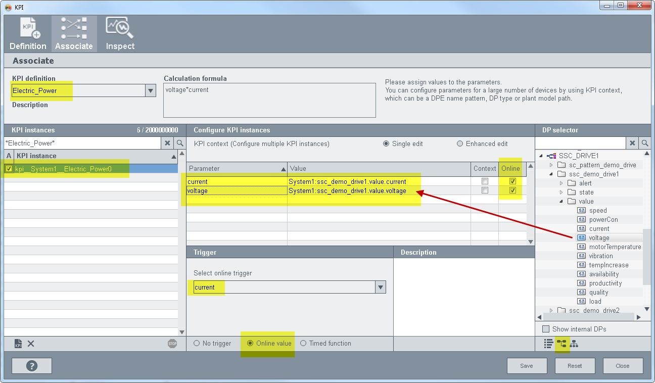 Create a KPI definition "Electric_Power". The example comprises an electric drive with current and voltage to calculate power. To create a KPI instance, a KPI definition must already exist. This example shows how to create a new KPI and attach it to the process image. For this example a drives datapoint type as shown in the figure at the beginning of this chapter must exist.