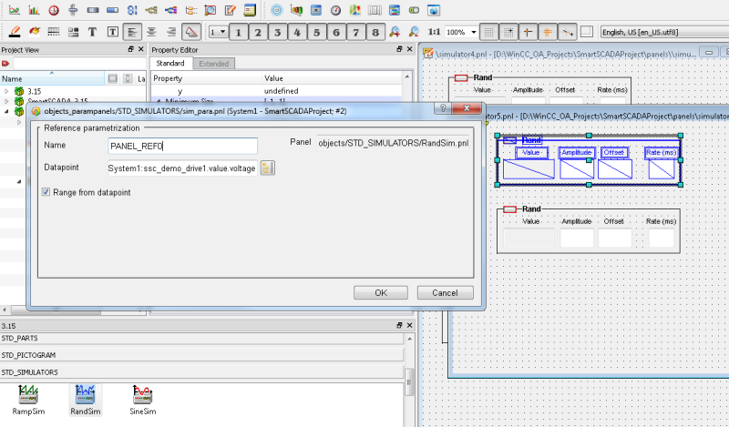 - Scroll down to the STD_SIMULATORS symbols and select the object "RandSim" by dragging and dropping it to your panel. The panel for the datapoint selection is automatically opened. Click on the PARA button and select the datapoint element "ssc_demo_drive1.value.current". Click on "Save" in the GEDI and open the panel via the WinCC OA console or via the Quick Test Module of the GEDI. Set the value range for the simulation and set it to active. Now values are generated for the datapoint "ssc_demo_drive1.value.current". Repeat the step to generate values for the datapoint "ssc_demo_drive1.value.voltage". You can also just copy the simulator in the GEDI and then change the datapoint in the datapoint selection panel. Now you are ready to take a look at SmartSCADA.