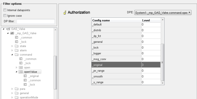 Add an authorization config to the master datapoint element "command.openValue" via the PARA module. Set the authorization of the _original config to 3. The authorization level 3 is the advanced operator authorization. It permits the execution of commands, explicit setting of replacement values,