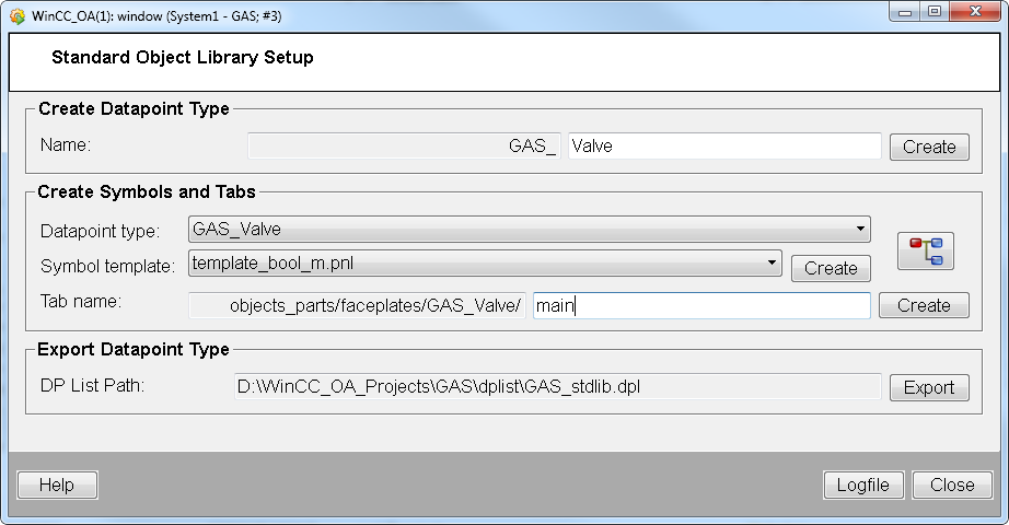 - The Stdlib datapoint type name must contain the prefix „<LIBRARYNAME_IN_CAPITAL_LETTERS>_“ e.g. GAS_Valve. If you do not use the Startpanel of the Standard Library, complete this step manually, see the steps Create a Datapoint Type for the Symbol and Create a Master Datapoint.