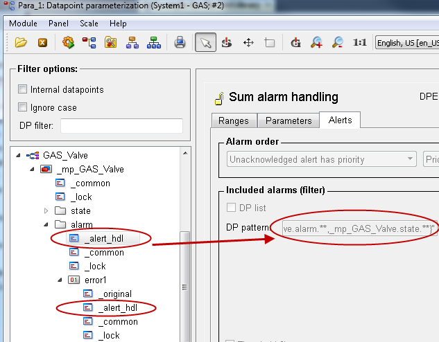 Configure alerts by configuring a sum alert directly on the alert node. Use the pattern "{_mp_GAS_Valve.alarm.**,_mp_GAS_Valve.state.**}".