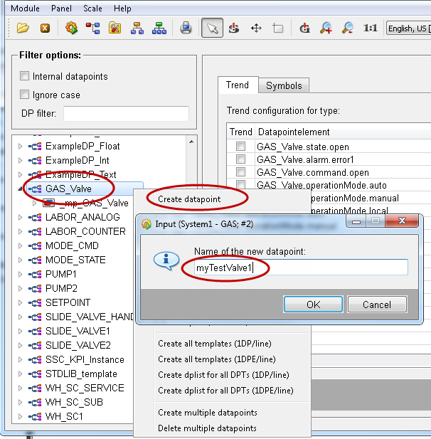 Create new datapoints of the datapoint type created earlier. The datapoints are created in order to display the symbol.