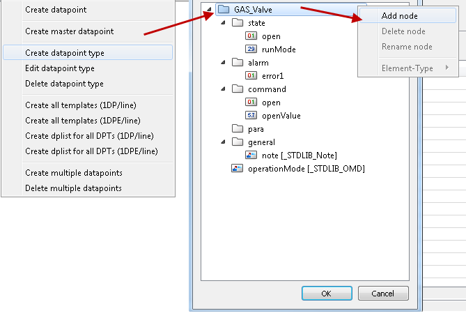 The datapoint nodes: state, alarm, command, para, general and the notes [_STDLIB_note] and operationMode [_STDLIB_OMD] are automatically added to the datapoint type.