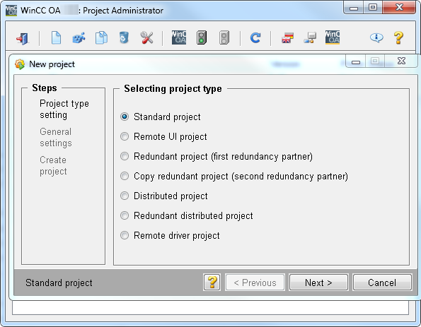 In the WinCC OA project administration, create a new standard WinCC OA project. Specify a name that is later the name of your library. Consider the WinCC OA naming conventions and that _ (underscores) may not be used. All names of the library datapoint types must use the project name as prefix.