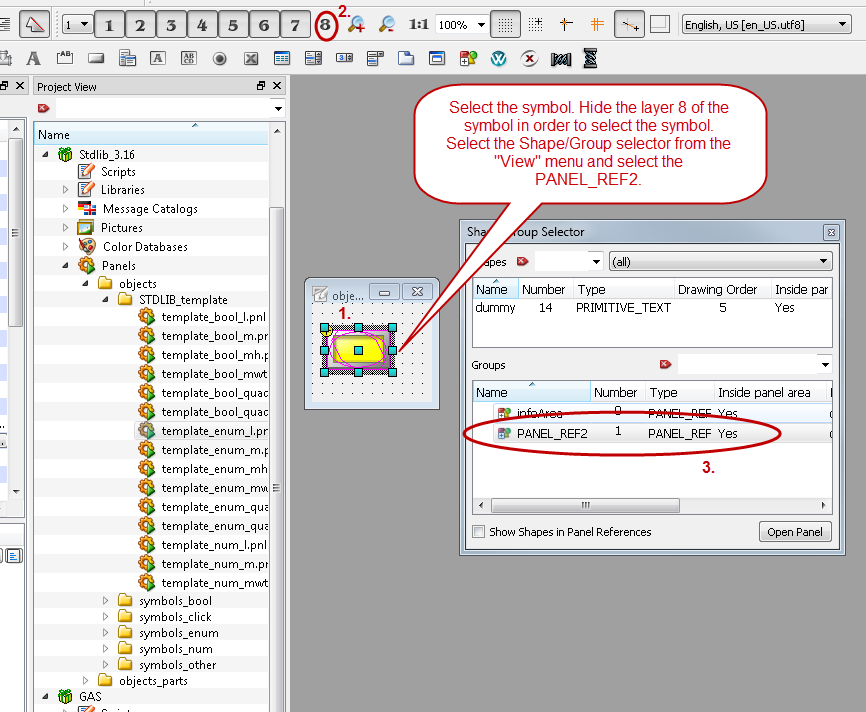 Double-click on the symbol template "template_enum_l.pnl" of the sub directory "STDLIB_template" in order to open the symbol in a new panel.