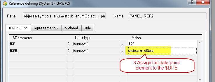 Figure: Reference definition - "mandatory tab" - Assign a datapoint element to the dollar parameter $DPE