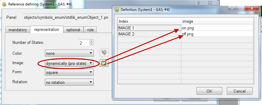 Select for the image the option "dynamically (pro state) and select two different images for the two states. In this example two images "off.png" and "on.png" are used.