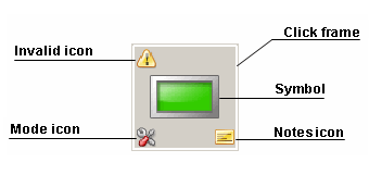 Symbols are provided with a click frame, which is positioned centrally over the symbol. Clicking inside this frame opens the corresponding faceplate. A click frame of a symbol is not normally visible in an opened faceplate, yet it can be, as click frames and alert frames are offset to each other. The alert frame flashes/shines in the corresponding alert color only when an alert is triggered by the datapoint.