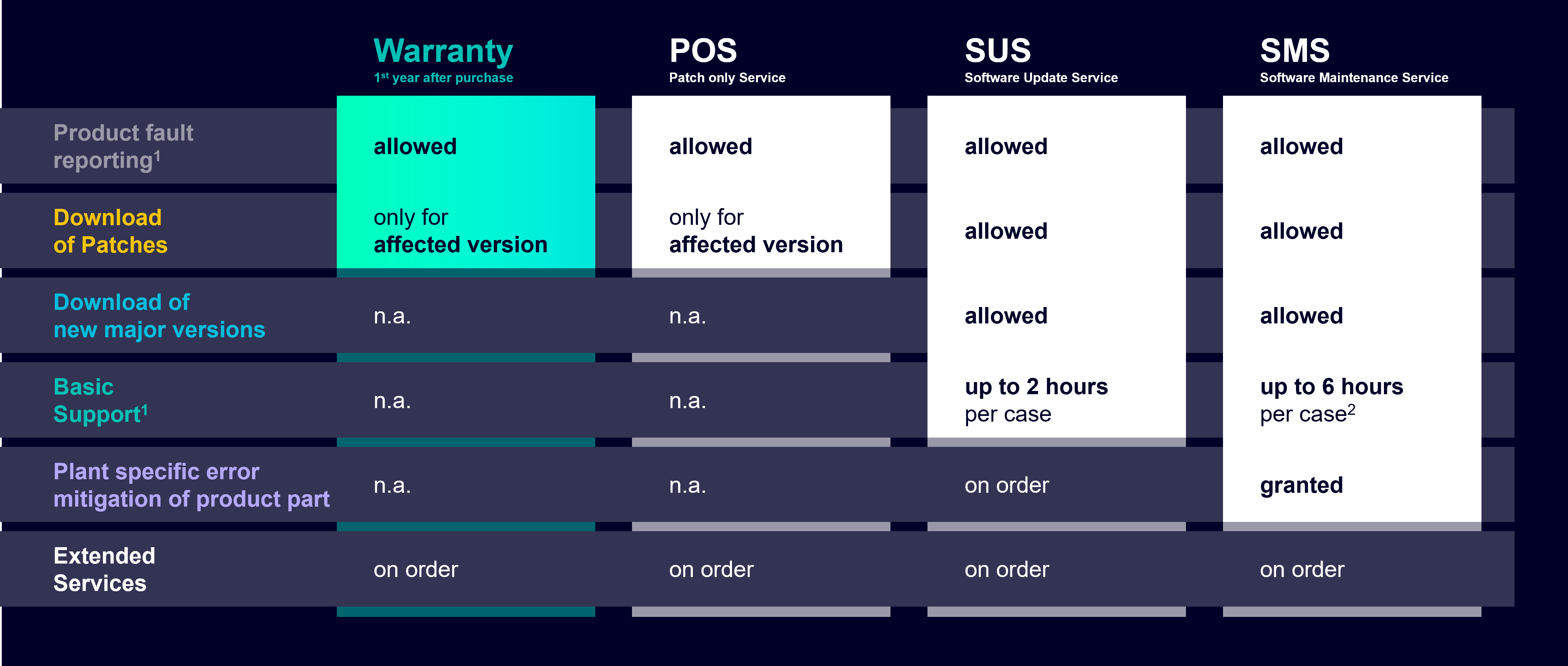 - Software Update Service (SUS) Download of WinCC OA updates and WinCC OA major versions (f.e. 3.18, 3.19, 3.20) is allowed (valid for 12 months, renewed automatically). Basic Support is granted on a fair usage principle (up to 2 hours per case on average).