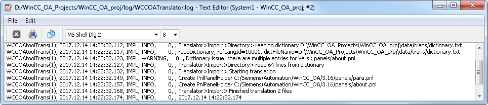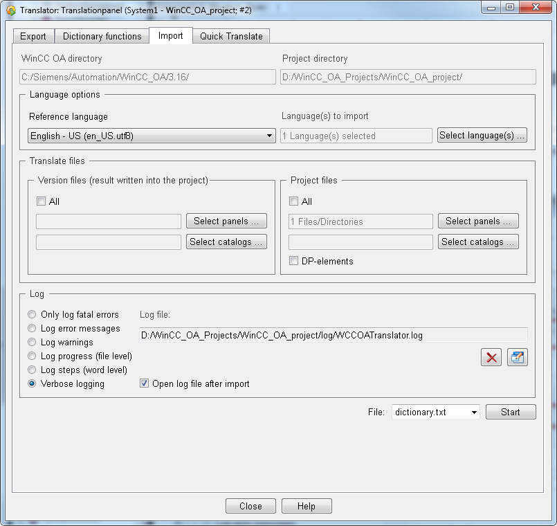 The Import function allows updating the panels, catalogs, datapoint- and alert texts with the translations saved into the dictionary (via Dictionary functions). You can also log only the changes that will be made during the import process without changing your original panels, catalogs and datapoint texts and check if you really want them to be changed.