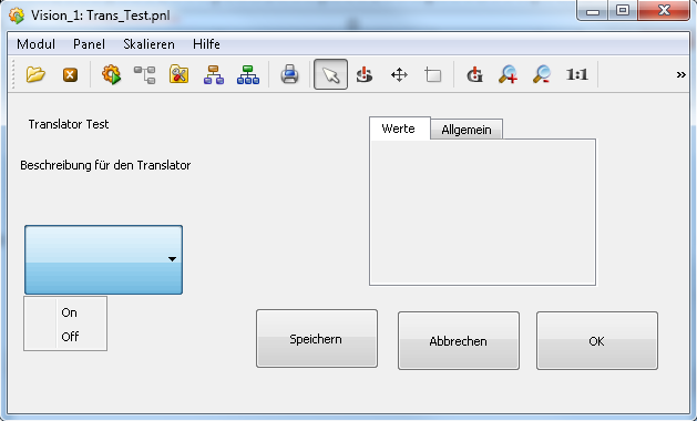 The project specific panel was easily translated into German. Open the panel in VISION with the language option "de_AT.utf8"----> -extend -lang "de_AT.utf8" -p Trans_Test.pnl The translated panel (shown in the figure below) is displayed.