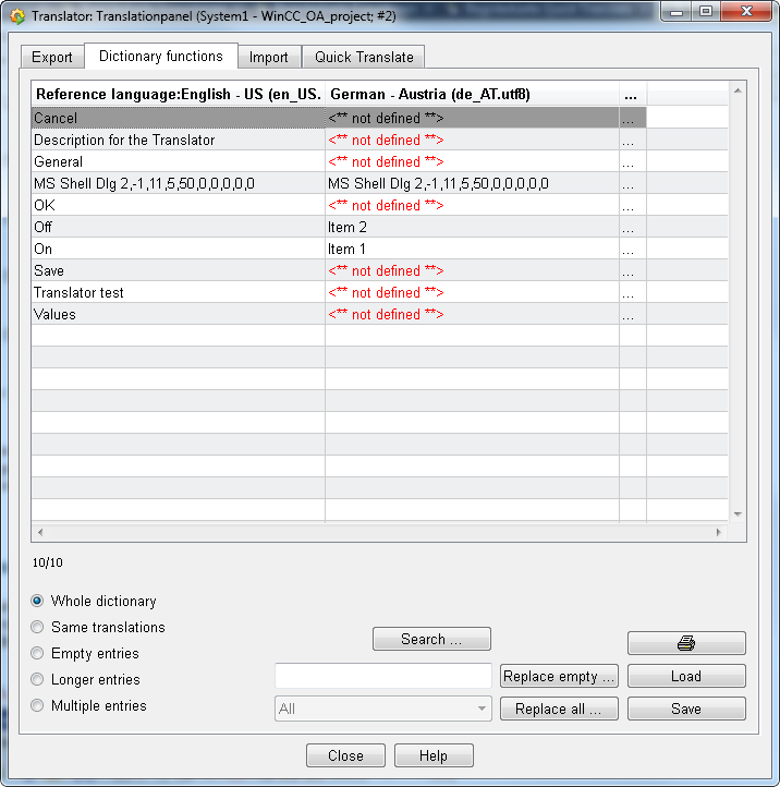 Translation of the reference language entries into the "target" language German - Austria via the Dictionary Functions.