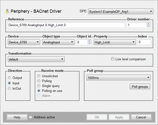 If the "Address active" checkbox is ticked, the driver address is used (see Reference tables). An inactive address is indeed possible and the attributes can be set and queried, but they will not be used by the driver. That means that for this datapoint element no values can be sent to the device and received from the device.