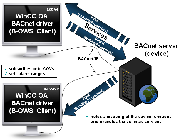 The services are transmitted via the client/server principle. WinCC OA acts as client and the BACnet device acts as server.