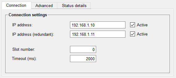 Tick this check box in order to activate the connection to the PLC. You can deactivate a device that is already created and configured. The status display changes from "Connected" to "Not Active" if a device is deactivated. If a connection has been deactivated, the driver does not communicate with the corresponding PLC anymore. So it is possible to prevent for example error messages when a PLC is intentionally removed from the system. Upon activation, a keep-alive query is sent to ascertain the availability of the PLC.