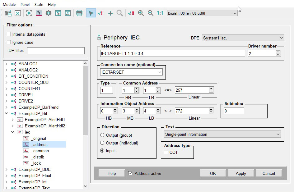 The IEC address in WinCC OA has the following format: "Type. Common Address. Information Object Address"
