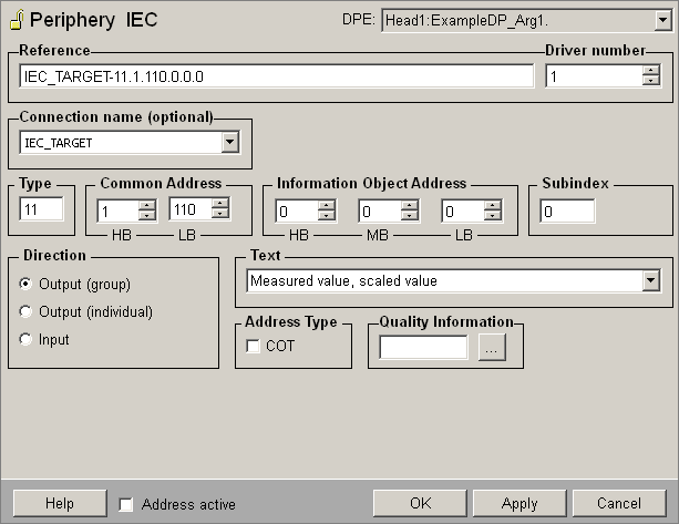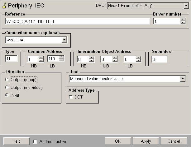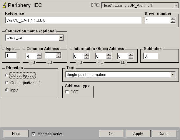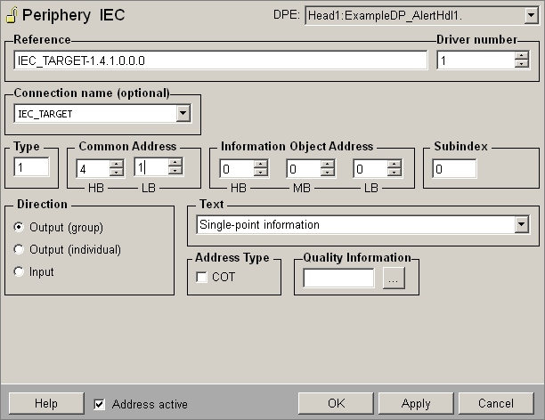Enter the addresses to your IEC for IEC_TARGET (see Parameters panel). In this example, two datapoint elements were used as addresses, one to send bit values and one for analog values: ExampleDP_AlertHdl1 for bit values, ExampleDP_Arg1 for analog values. These elements must be created on the two systems and contain the config _address containing the peripheral address and config _original used to send the values.