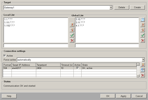Define the connections (_IecConnection) using the appropriate panels (see Panel for connections). The client "IEC_TARGET" datapoint gets the following connections: