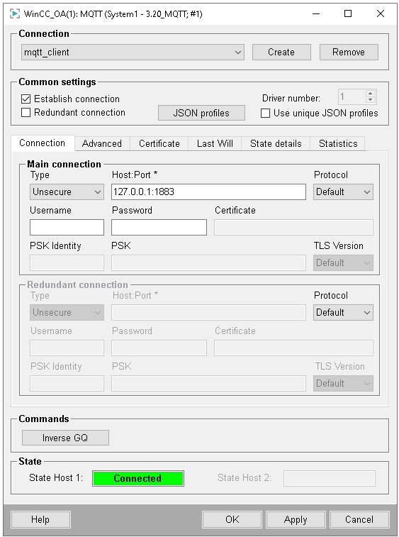 | Last Will | Last will settings to define what the broker shall send to other clients if the driver loses connection. |