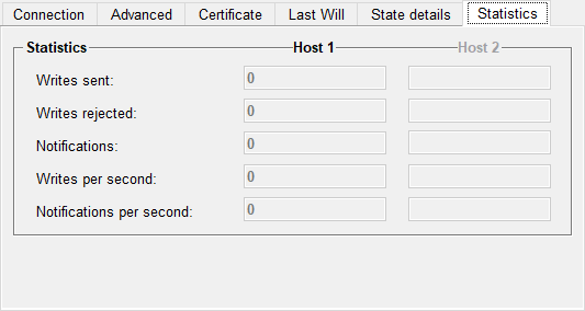 This tab provides statistical information on data sent and received. Any information applies to data values not messages.