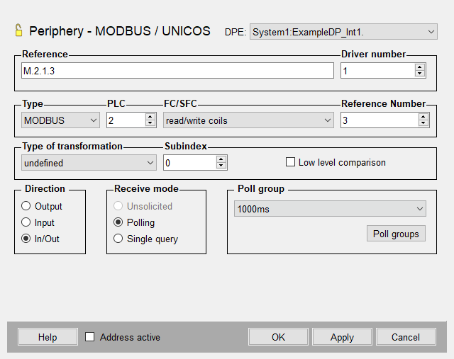 Note:Assure that the used function codes are compatible with the data types! The driver only checks the compatibility of the function code with the transformation type.Note:By spontaneous input mode and function code FC 15 (force multiple coils) only use reference numbers divisible by 16 (an error message is shown when using numbers not divisible by 16) . The sub index can lie between 0 and 1919. For all other cases this modulo 16 limitation does not exist.