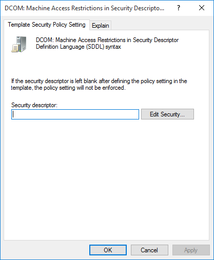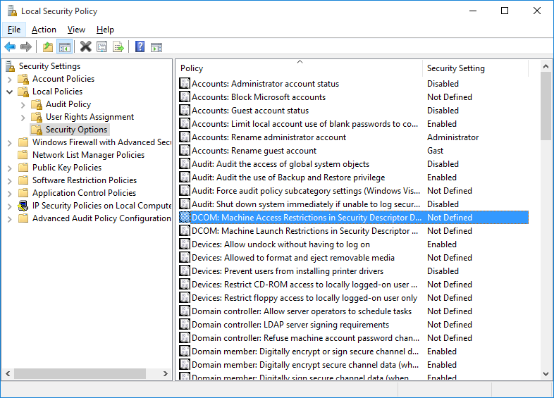 Go to Security Settings > Local Policies > Security Options,open the context menu with a right mouse click onDCOM: Machine Access Restrictions in Security Descriptor Definition Language (SDDL) syntax and select the Properties entry.