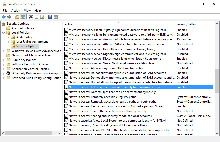 Security Options - Network access: Let Everyone permissions apply to anonymous users