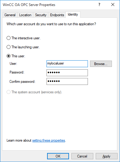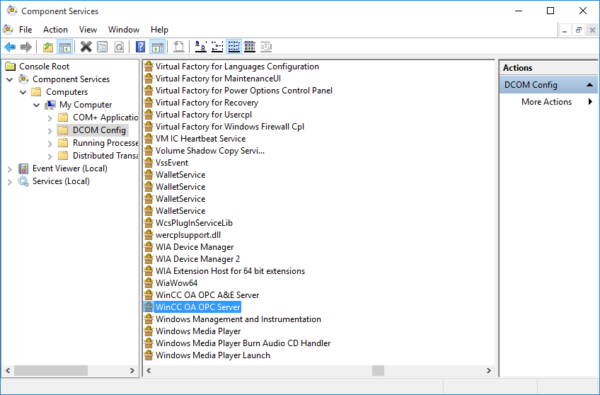 DCOM was meant to be used in networks without any active firewall and where all computers belong to the same domain. Therefore, the configuration of DCOM in current networks is rather complicated and does not meet the increasing security requirements. The settings described in this chapter also have a negative impact on the network security. Therefore, to maintain the network security, we recommend to install a minimal WinCC OA version on the computer on which the OPC server is running and start the OPC driver as remote WinCC OA driver.
