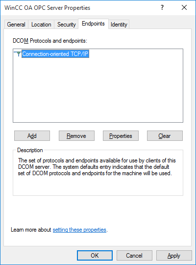 Change to the Endpoints tab. If the Connection-oriented TCP/IP entry is not displayed in the DCOM Protocols and endpoints field, you have to add it as follows:
