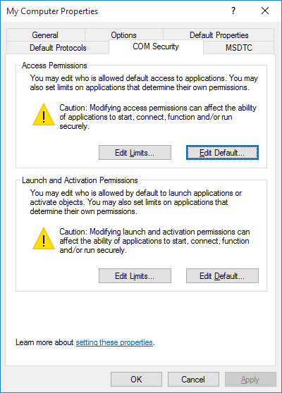 Go to Console Root > Component Services > Computers in the tree view, click on My Computer with the right mouse button and select the context menu entry Properties.
