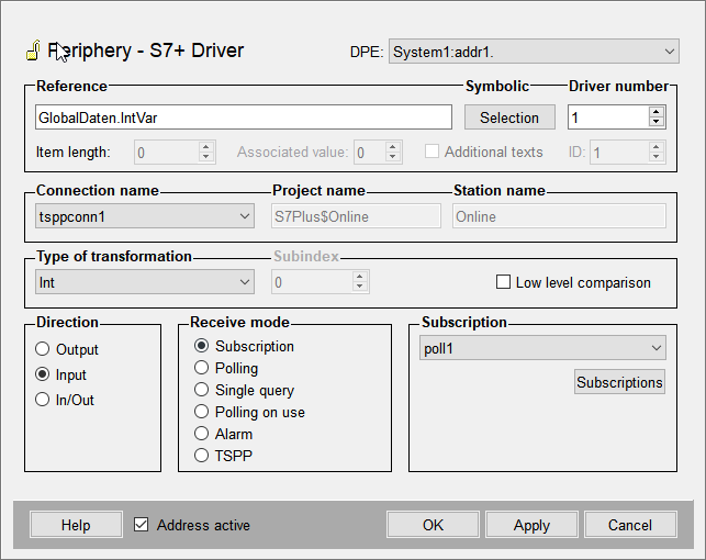 If you enable this check box, the address is created in the driver (see also reference tables). Attributes can be set and queried for an inactive address, however, the address does not exist for the driver. This means that no values can be sent or received from the PLC.