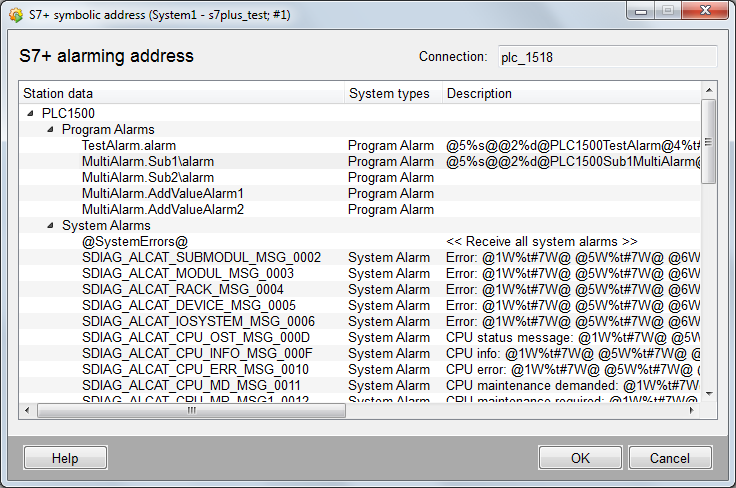 When the driver is active, click on the Selection button to browse and select the respective alarm data. There are system alarms and user defined alarms (program alarms).