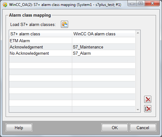 Click on the "S7+ Alarm Class Mapping" button in the system management panel to map the TIA portal alarm classes to WinCC OA alarm classes. Without this mapping, the alarm class of the respective _alert_hdl config is used for new alarms.