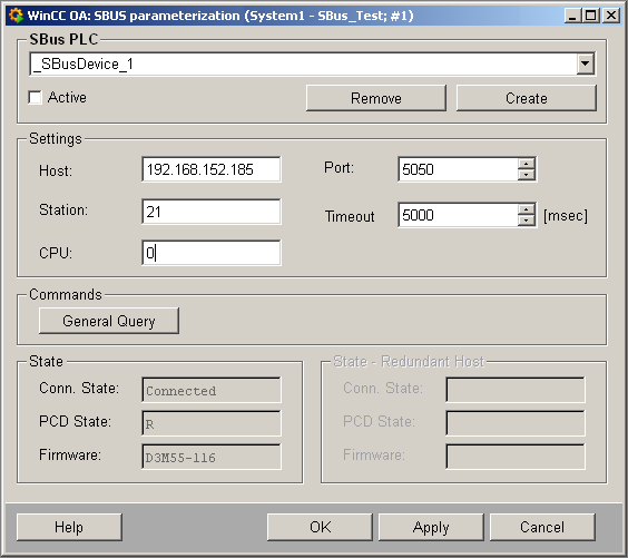 This setting can be changed according to the connection latency between PLC and WinCC OA. A time-out with less than 4000ms is not recommended due to the fact that a correct behavior of the retransmit routine of the S-Bus protocol cannot be granted.