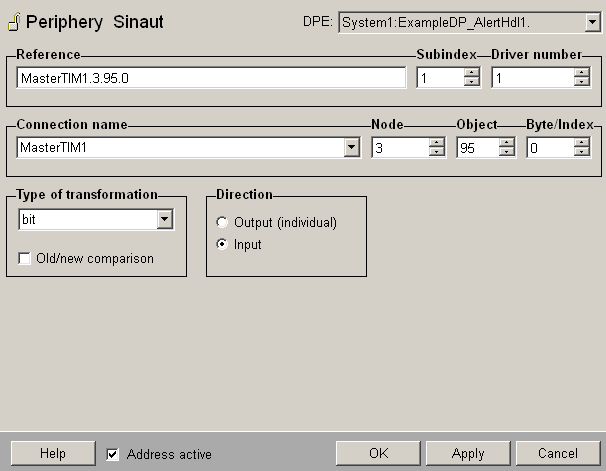 If the check box "Address active“ is ticked, the driver address will be used (see Reference Tables). An inactive address may be possible and the attributes can be set and queried, but will not be used by the driver. That means, that no values can be sent by the Master TIM or can be received from the Master TIM for this datapoint element.