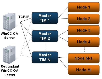 The communication between the WinCC OA SINAUT driver and the SINAUT nodes (stations) is done through TCP/IP via one Master TIM as gateway. This means that a direct communication between WinCC OA and the nodes is not possible. This has the advantage that the connection-specific settings (switched connection, fiberoptic, etc.) are handled by the Master TIM and stay for WinCC OA completely transparent.