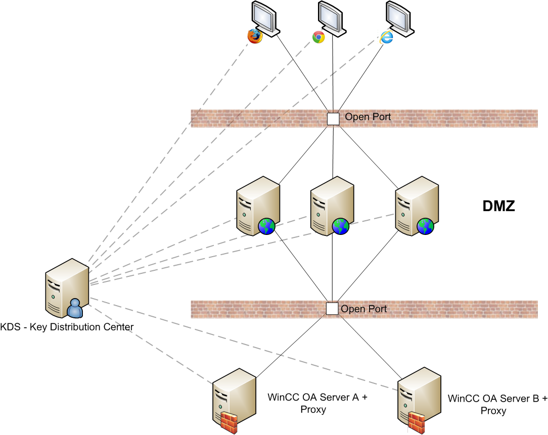 Putting the web server in a demilitarized zone (DMZ) increases the overall security of your system. For SSO a Key Distribution Server (KDS) in form of Kerberos has to be configured on a dedicated machine. The KDS has to be reachable from every host which is in involved in the ULC UX configuration (WinCC OA Servers, HTTP Servers, Web Browsers, etc)