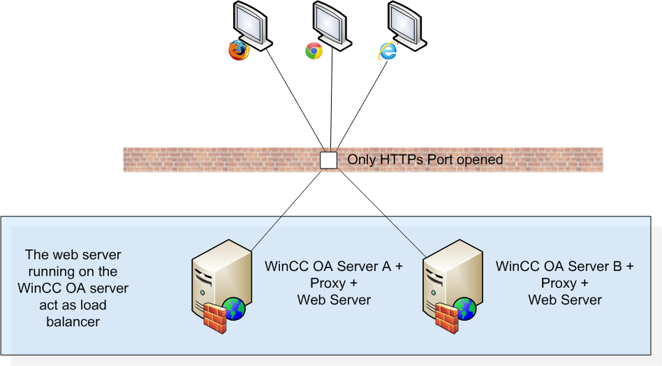 This configuration supports redundant WinCC OA servers for higher availability. In a redundant system the HTTP server uses both of the redundant servers as load balancing hosts (when the HTTP server is running on any of the servers). In this case it is required to run the HTTP server CTRL manager with the parameter “-connectToRedundantHosts”.