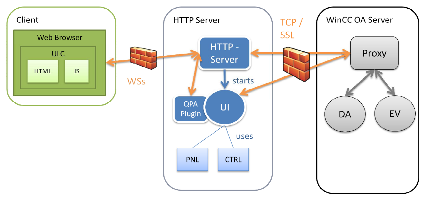 The basic architecture displayed in the figure below gives an overview for the involved WinCC OA managers or software modules for the WinCC OA ULC UX.
