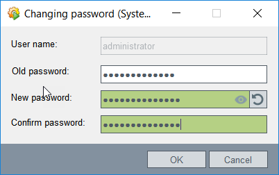 Password: Opens a window where you can change the password. The Password button displays three text fields: Old password, New password and Confirm password. Note that a password can only be set after the corresponding user has been created!