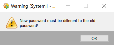 In order to change your password, type the old password in the Old password text field and the new password in the New password text field. An empty password is not allowed. Confirm the password and press OK. The password has been changed. Note that your new password must differ from the previous password. If you enter the same password, an error message is shown: