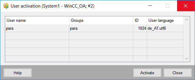 - User name: Name of the user that can be activated. Note that several users can be selected and activated at once.