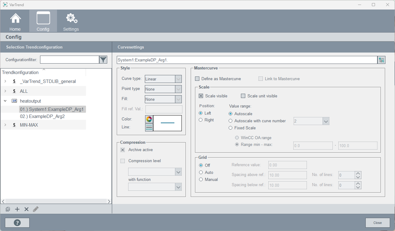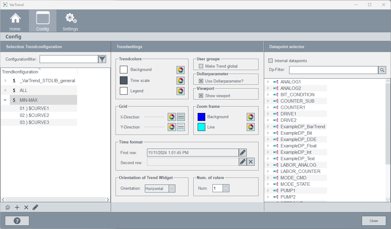 If a trend configuration is selected, the parameters of that configuration are displayed. In addition, a datapoint selector is also shown. This allows you to add curves to the current trend configuration by drag and drop. The individual sections of the Trend Settings are described below.