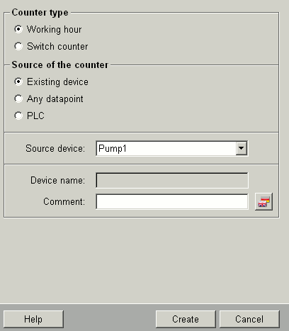 WHs and SCs are created on a specially designed panel. The objects (datapoints) to which the counters refer must exist in WinCC OA (exception: count in control - PLC - for WH). The panel for creating the counters is displayed by pressing the "Operating-time/Operations counter" button on the "Settings" tab of the System management panel.
