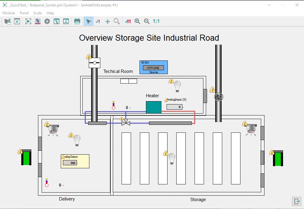 Along with the WinCC OA BACnet package, two example panels are supplied. These show a storage site - one with simple symbols and one with technological symbols. In this example, the panel "Testpanel_Symbs.pnl" is used. Open this from the directory <C:\Siemens\Automation\WinCC_OA\3.20\ _installation_directory>\BACnet_<version>\panels.