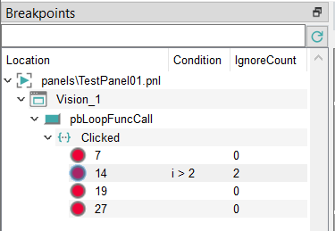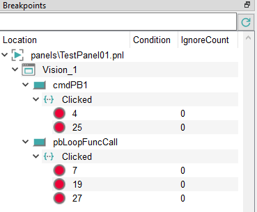 Breakpoints can be set on the tab of the same name. When a breakpoint is set, the execution of a script stops where the breakpoint was set. Note that breakpoints are shown only after