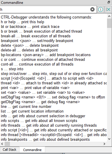 Down right in the panel, the old CTRL debugger commands and variables are shown. The commands can be used. Click on the I button or enter "h" into the input field and the commands are shown (see first figure below). Double-click the command and the command is shown in the input field and can be used. With e.g.. delete-all you cal delete all breakpoints.