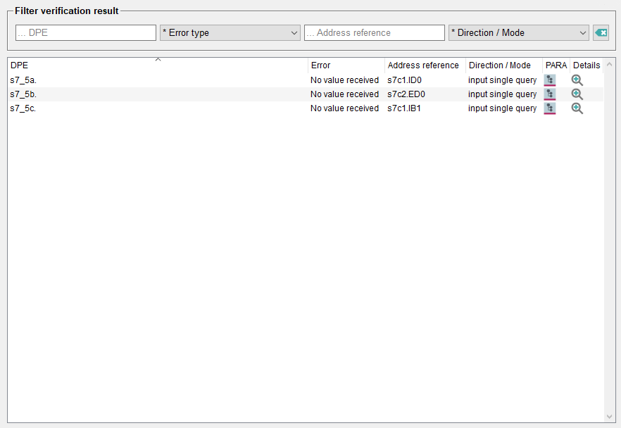 The result can be filtered according to the DPE, the error type, the address reference or the Direction/Mode.