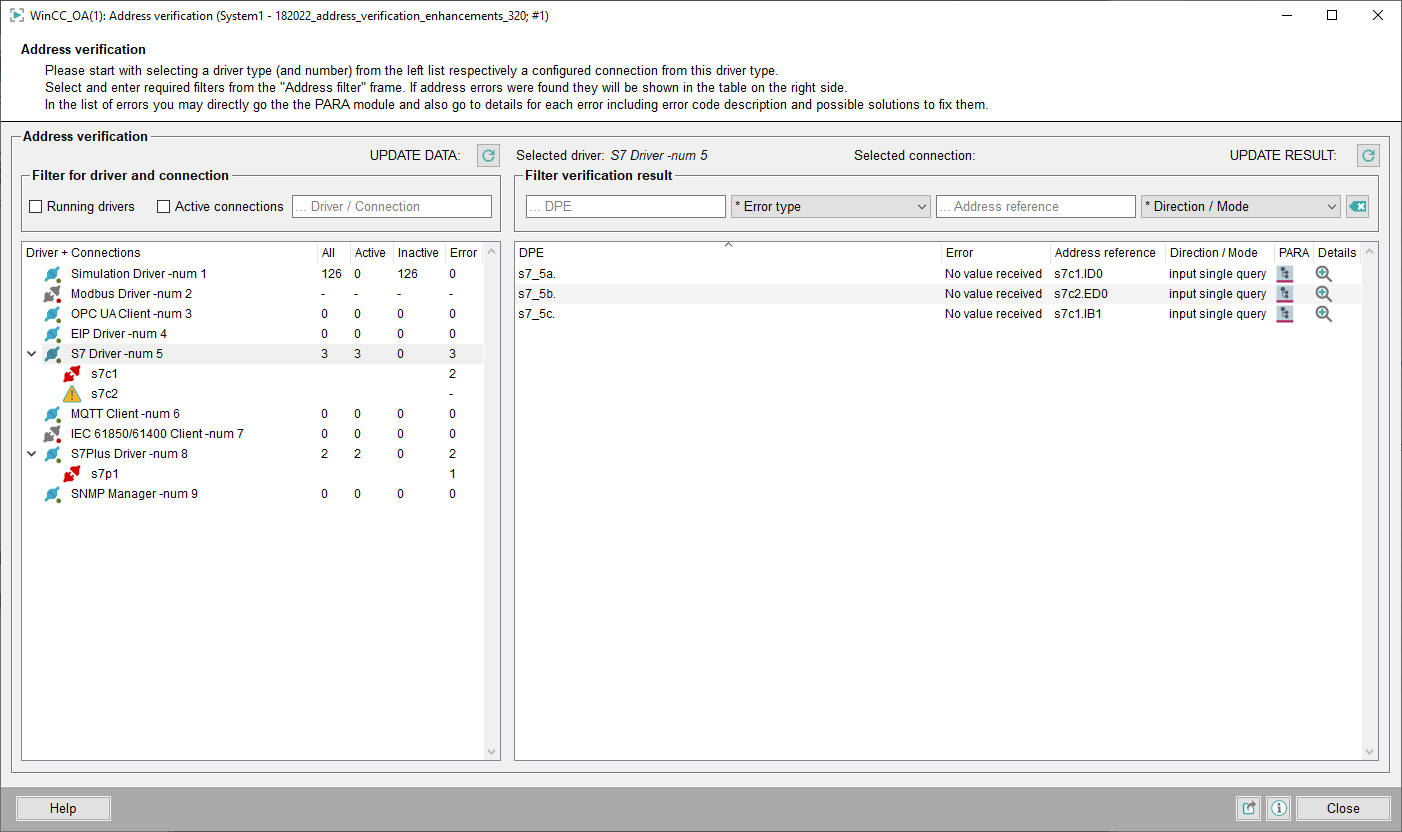 The Address Verification panel can be accessed via . It aims to provide an overview of all current drivers and their connections, along with the present state for both. By selecting a driver or a connection in the left-hand panel, you can query incorrect addresses for the selected element.